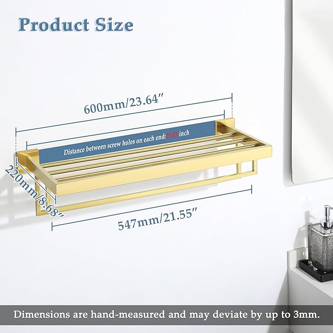 - 【DOUBLE TOWEL BARS】 The towel rack is designed with double towel bars to ensure more space for towel storage, making your bathroom look tidier. Note: The length of the towel holder is 23.6 inches, the towel bar hanging length is 21.2 inches, and the distance between the left and right mounting holes is 21.55 inches, Measure the size of your bathroom space before you buy.