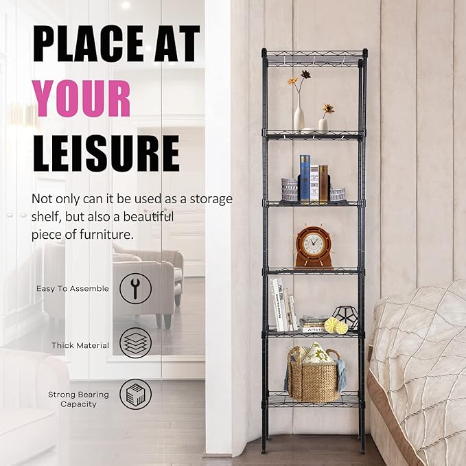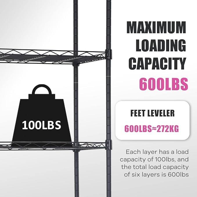 - 【Solid&Durable】Our storage shelves is made of heavy-duty steel wire.Durable enough and not easy to accumulate dirt and corrosion. Each shelf can support a weight capacity of up to 100lbs with a maximum weight capacity of 600lbs for entire unit. It can meet most storage and all home storage needs.