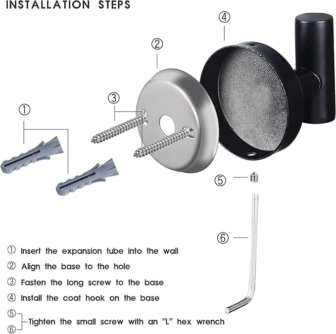 - Easy Installation; The product comes with screws and anchors required for installation, easy and fast installation, suitable for leveling smooth WALL surfaces, the hook only need simple to clean can be hung coat, towel etc.