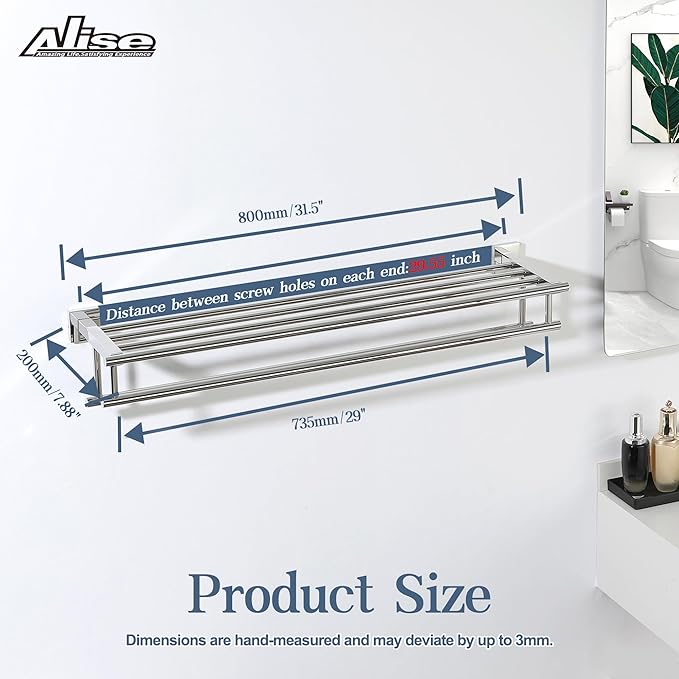 - 【Large and Practical Design】Unique double towel bars design makes the overall line smooth and beautiful, and ensures a larger storage space for towels, so that your towels can be stored neatly on it. Note: The length of the towel rack is 31.5 inches, the towel bar hanging length is 29 inches, and the distance between the left and right mounting holes is 29.55 inches, please pay attention to measure the mounting distance to make sure it is suitable