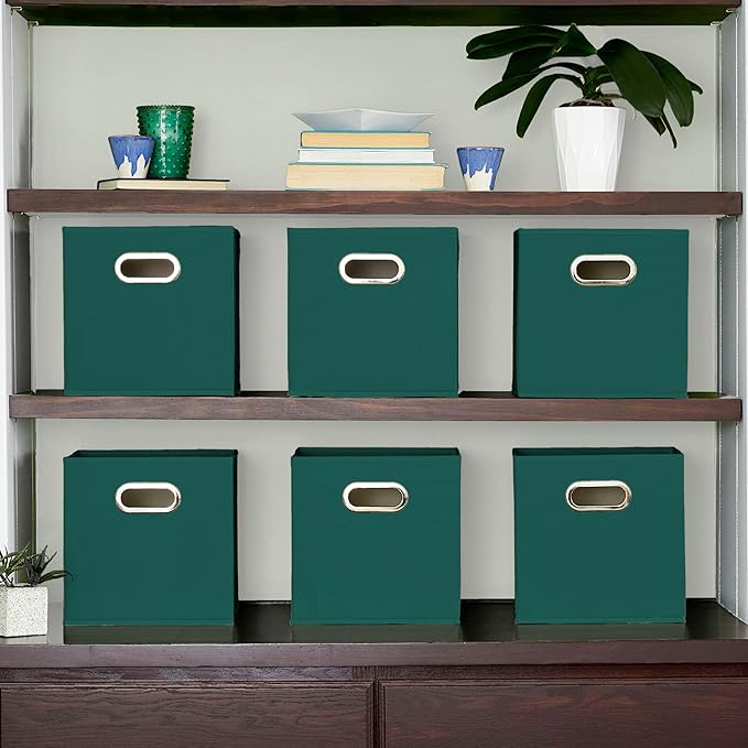 Household Essentials Fabric Storage Cube Bins, 6 Piece Set, Strong Poly-Woven Fabric, Chipboard Sides, Grommet Front Handle, Stackable and Foldable, Classic Design, Green