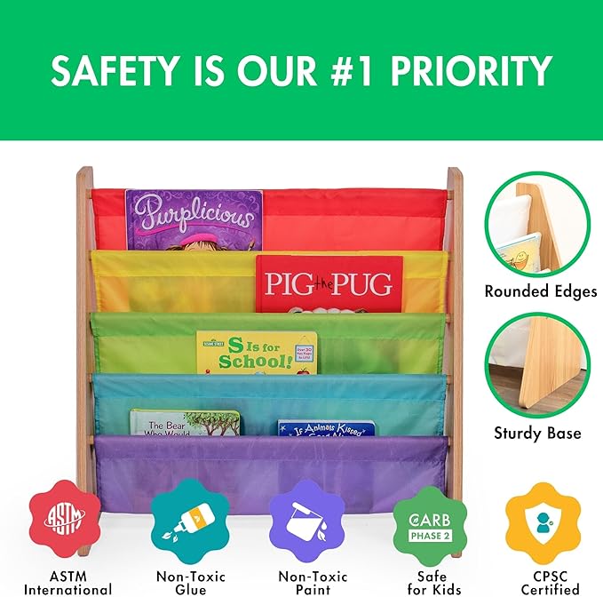 Humble Crew 4-Tier Kids Bookshelf, Natural Wood/Rainbow - Premium Book Shelf for Kids Rooms with Four Deep Pockets - Toddler Sling Book Rack with Deep Sleeves, Nursery Bookcase Organizer