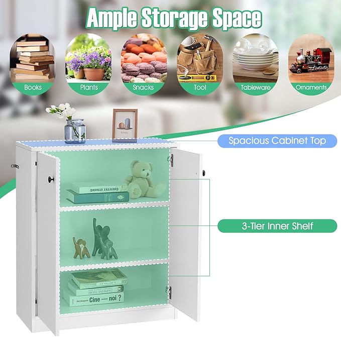 - Large Storage Space: This storage cabinet with two doors can keep your items clean and dry. The 3-tier inner shelf provides ample storage space and allows you to classify different items. Plus, the spacious top is a good place to showcase artwork, potted plants, photos and more.