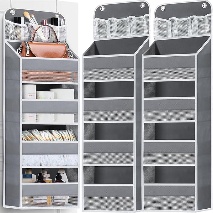 2 Pack Over The Door Organizer, Hanging Storage Organization with Large Capacity Pockets, Swing-Proof Behind Door Storage Shelf for Kicthen Bedroom Nursery Kids Toys Shoes, Grey