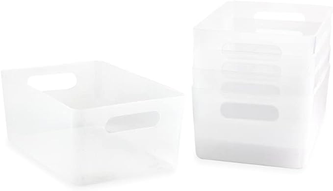 - SLEEK DESIGN: This sleek storage set is the perfect solution to all your home organization needs. Each of the 5 bins feature cutout side handles that make them easy to retrieve from pantries, fridges, closets, and more. The translucent smooth design, and glossy finish allows them to seamlessly blend in with your existing home decor. They are as stylish as they are functional, and will make any space look neat and organized in a snap! Great for shelves, drawers, and cabinets.