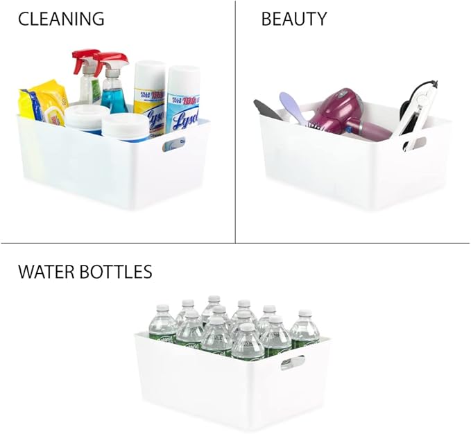 - MULTI-USE: These BPA free bins can be used all around the home for optimum storage. Great in the kitchen, these bins are large enough to store cereal boxes, chips, cookies and other snacks. Use them to keep items like paper towels, sandwich bags and aluminum foil organized. They’re also perfect for closets and bathrooms! Group cleaning supplies together in one bin to keep under sink storage tidy, or use them to hold toiletries like hair, bath, and body products.