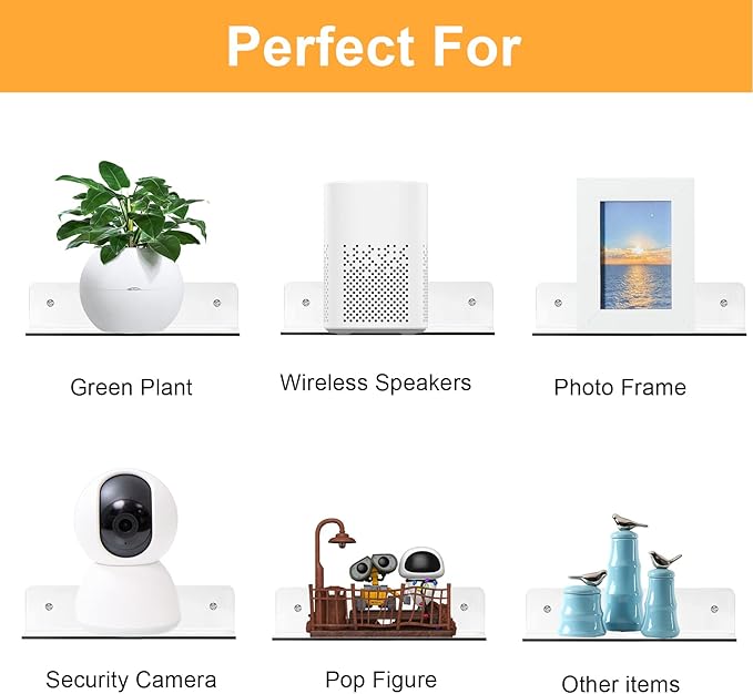 - 【Decorative Shelves for Wall】: Transforms the wall space into display area offers a convenient and elegant way to store security cameras, wireless Bluetooth Speaker, Smart Speaker, Action Figures, Smart Speaker, Remote, Glasses and more.