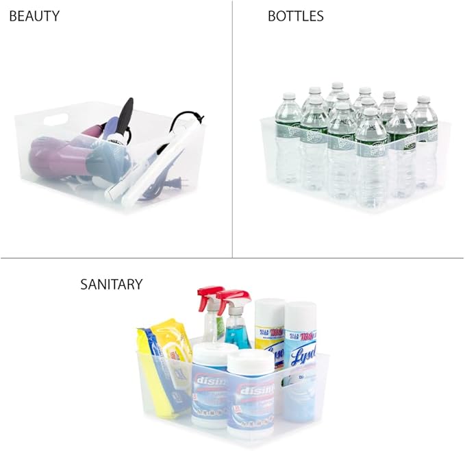 - MULTIFUNCTIONAL: These storage bins become essential accessories when you put them to use on the bathroom vanity. Line one with makeup and beauty accessories, like brushes, lipstick, or nail polish, and use another bin to clean up the mess of toiletries, and free up counter space. Fill a bin with kid-sized snack bags and leave it in a pantry or on a kitchen shelf. Use it in the fridge to neatly hold and arrange cold cuts, cheese, fruit and veggies, or juice boxes and yogurt pouches.