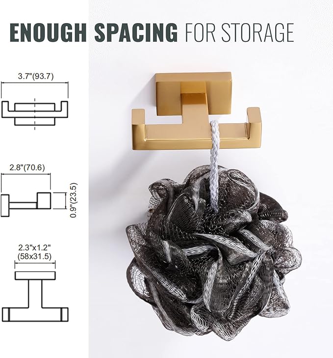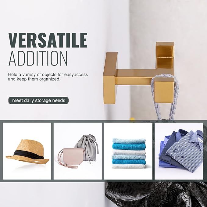 - DOUBLE BATHROOM TOWEl HOOK: The double gold towel hook give the ability to declutter your home and hold daily stuff like towels, clothes, caps, bags, and loofahs for easy access, effectively organizing your space, adding a touch of neatness to your home