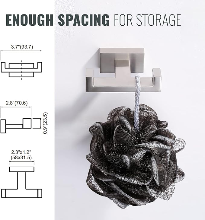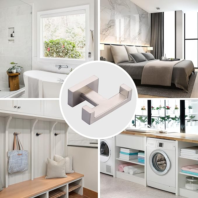 - DOUBLE BATHROOM TOWEl HOOK: The double brushed nickel towel hook give the ability to declutter your home and hold daily stuff like towels, clothes, caps, bags, and loofahs for easy access, effectively organizing your space, adding a touch of neatness to your home