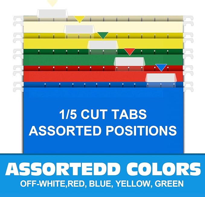 - ENHANCED ORGANIZATION: Straighten up your files and break your file drawers into easily-spotted smaller groups with 5 assorted colored hanging file folder.
