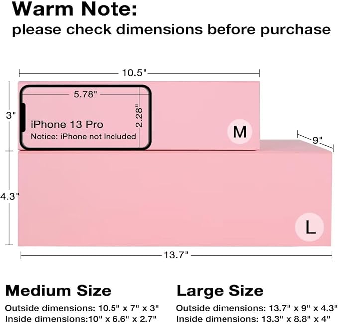 - Pink Gift Boxes - boxes are shipped flat; large pink collapsible gift box with magnetic closure, assembled box outside dimensions 13.8 x 9 x 4.3 inch, inside dimension 12.5 x 8.66 x 4.13 inch.