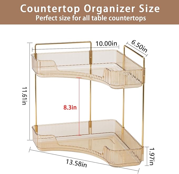 2-Tier Corner Bathroom Counter Organizer – Classic Storage Shelf for Makeup, Perfume & Toiletries, Space-Saving Countertop Tray Fits Bathroom, Dresser, Kitchen (Vintage Gold)