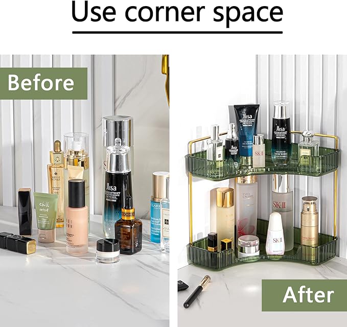 2-Tier Corner Bathroom Counter Organizer – Storage Shelf for Makeup, Perfume & Skincare, Space-Saving Countertop Tray Fits Bathroom, Dresser, Kitchen (Green)