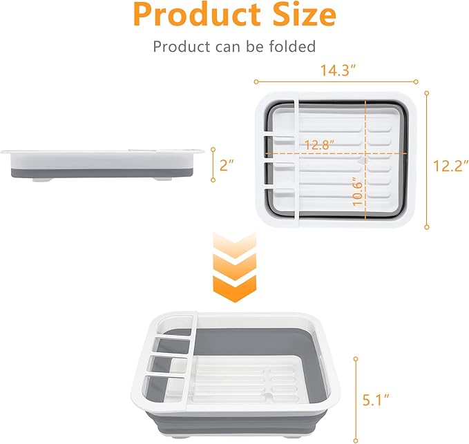 - Foldable & Space-Saving Design: The collapsible dish drying rack features a space-saving design that easily folds away to a compact 2.16-inch thickness for storage, making it perfect for kitchens, RVs, campers, and travel trailers. Unfolded dimensions: 14.4 x 12.2 x 4.92(H) inches