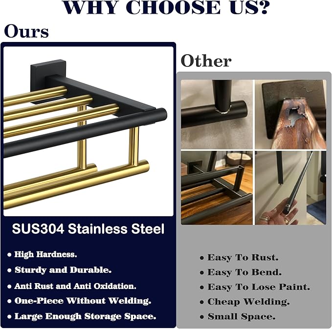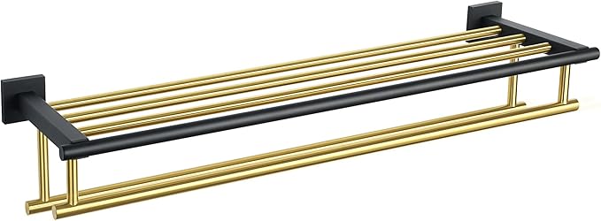 - 【Gold and Black Finish】The towel hanger is finished by black and gold two-color combination, dazzling and beautiful appearance, able to resist daily corrosion and oxidation, suitable for a variety of bathroom styles, it can instant improve the Luxury level for your bathroom