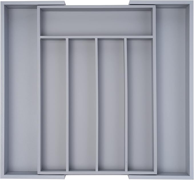 - 【Solved Storage Space Problems】Our gray bamboo sliverware organizer is an absolute necessity for kitchens everywhere. Designed with 5-7 compartments, the kitchen drawer organizer can for flatware & utensils storage with two additional compartments for larger kitchen tools which can save space while accommodating multiple items. It is worth mentioning that our 10" - 15" wide, 14" long and 2" deep utensils organizer can be expanded from 10 to 15 inch wide, perfect for any kitchen drawers.