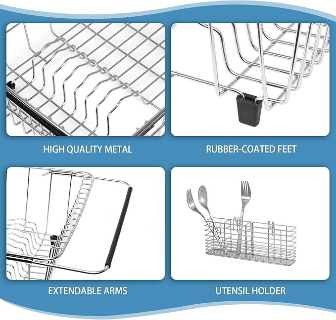 - Non-slip: extendable rubber arms keep the rack from sliding into the sink, and four rubber-coated feet protect the countertop and sink from scratches.