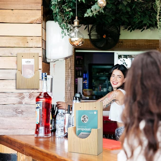 - 5.Multipurpose:Hanging Brochure Holder is perfect for displaying your brochures, advertisements, signs, announcements, flyers, restaurant menus, etc. Wooden features allow you to in offices, restaurants, hotels, libraries, schools, exhibitions, bars, wedding events, etc. Places attract people's attention.