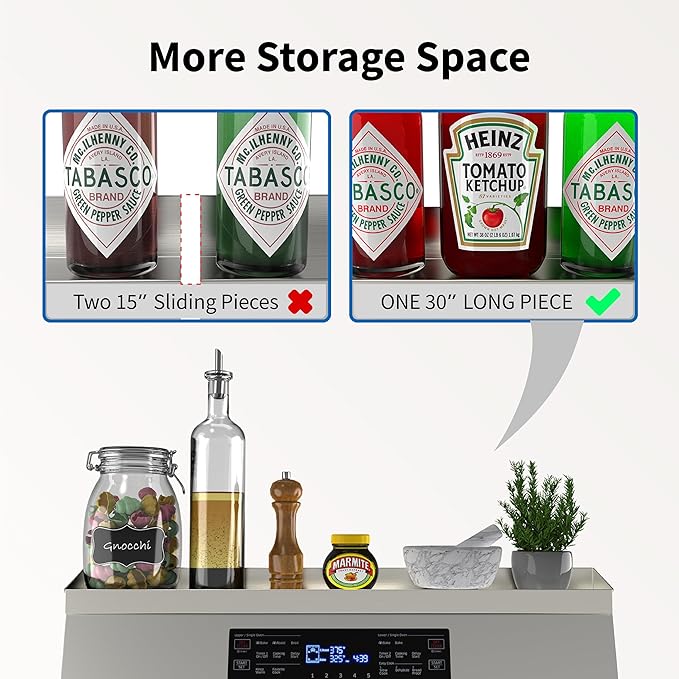 - ๐งก ใ๐ ๐๐ฅ๐ฅ๐ข๐ง๐ ๐๐ซ๐๐ฏ๐๐ง๐ญ๐ข๐จ๐งใThis over-oven shelf features front and back lip, left and right side sheets to prevent falling while opening or closing your oven door. From premium thick stainless steel sheet, a sturdy oven top shelf gives you a more refined look and a better kitchen experience.