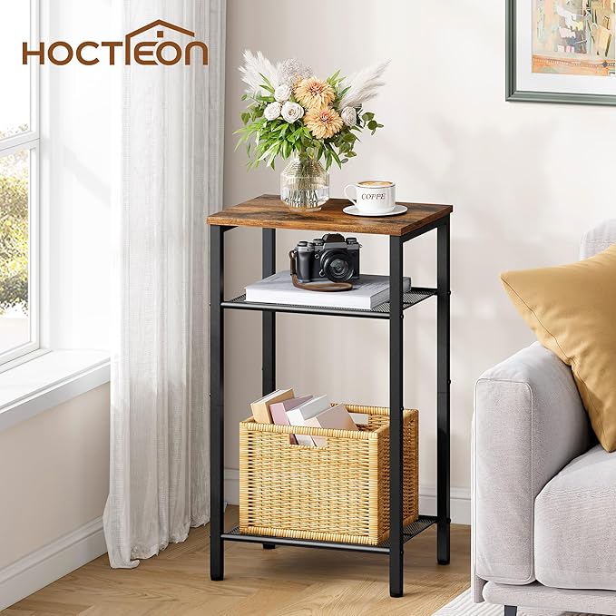 Hoctieon 2-Set 3 Tier End Table, Telephone Table Set of 2, Tall Side Table with Storage Set of 2, Small Nightstand for Small Spaces, Metal Frame, for Living Room, Bedroom, Sofa Couch, Rustic Brown