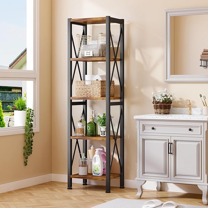 Homeiju 5-Tier Narrow Bookshelf, Ladder Bookshelf, Tall Bookshelf for Bedroom with Open Shelves, Office Bookshelf, Industrial Standing Bookshelf for Bedroom, Living Room and Home Office