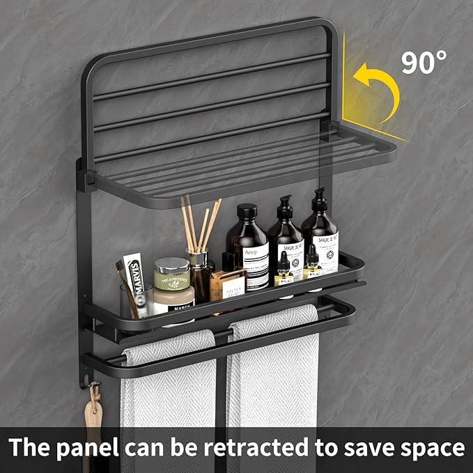 22.8Inch Towel Rack for Bathroom and Lavatory Towel Hanger with Wall Mount Towel Bars 304 Stainless Steel No Drill (Collapsible Black Towel Rack with Bathroom Organize Shower Shelves)