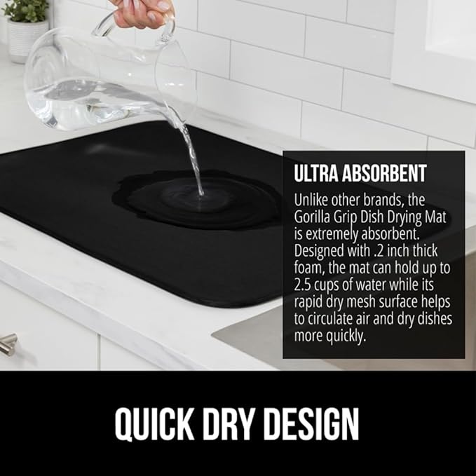 GORILLA GRIP Ultra Water Absorbent Microfiber Dish Drying Mat, 18x24, Quick Dry Thick Mesh, Slip Resistant Pad for Sink Dishes or Under Rack, Kitchen Counter Accessories, Machine Wash Mats, Black
