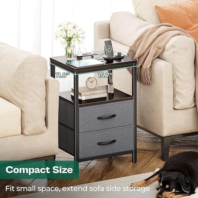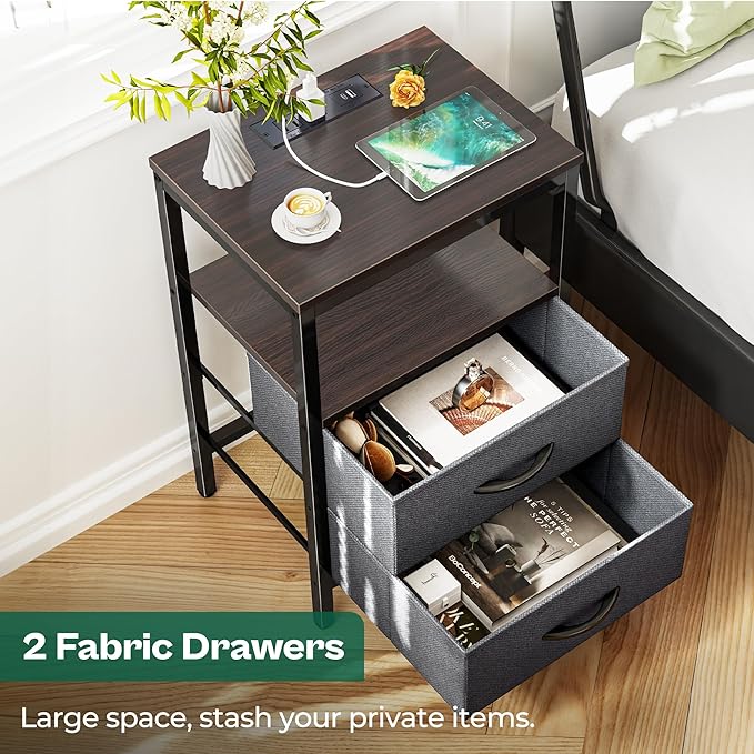 Huuger Nightstand with Charging Station, Fabric Drawers, End Table with Open Shelf, Bedside Table with USB Ports and Outlets, Night Stand for Bedroom, Walnut