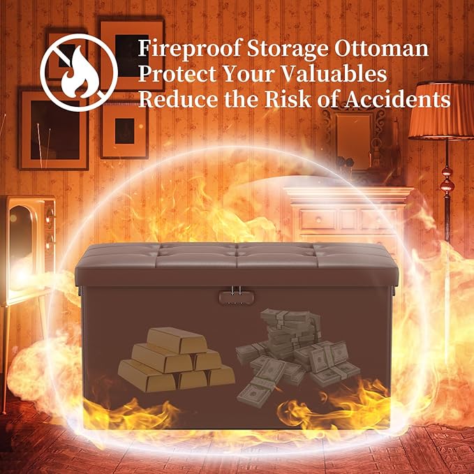 - Fireproof and Water-resistant(30"X15"X15"): Compared with other storage ottoman,our fireproof storage ottoman bench is made of 3 layered non-itchy silicone coated fiberglass which stands up the temperature up to 2000℉.The Storage Chest is fireproof and waterproof,which can effectively protect your important files in a fire and wet weather. They will further keep your files intact. It has been passed by SGS TEST(UL94 Certified) for a longer life and can be used with peace of mind.