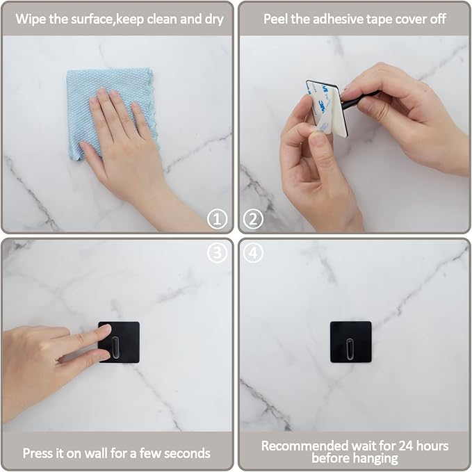 - 【EASY TO INSTALL AND REMOVE】No need to drill, just remove the protective film on the back of the hook and press it to stick on the smooth hard wall. Recommend to wait for 24 hours before using black hooks. When removed, use a hair dryer to heat the melted glue, it can be removed easily and cleanly. No damage to the wall.