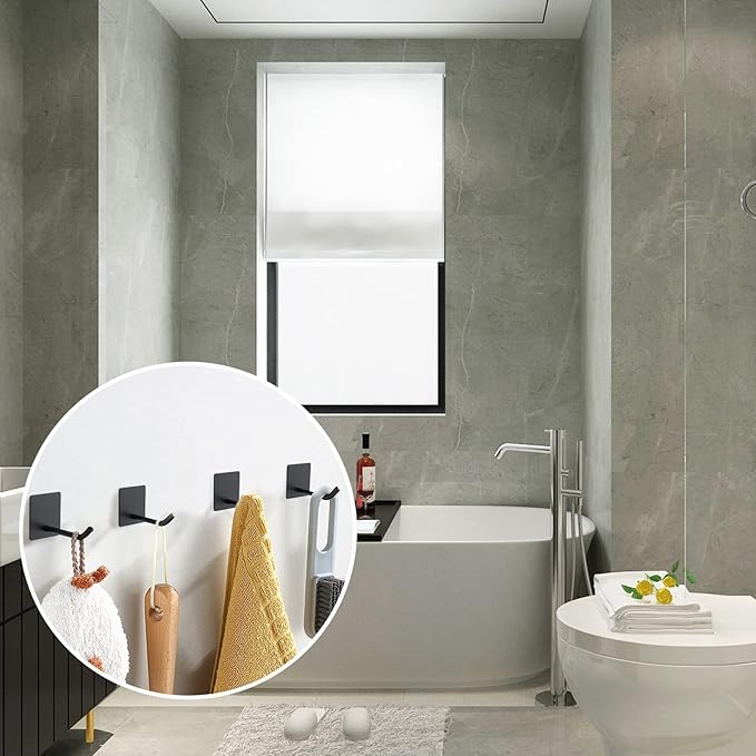 4PCS Adhesive Sticky Wall Hooks Heavy Duty, Long Stainless Steel Towel Hooks for Hanging Kitchen Bathroom Home, Waterproof Hook Wall Hanger Holder for Key Hat Coat Bag (Black)