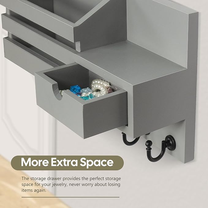 FifthQuarter Key and Mail Holder for Wall, Mail Organizer Wall Mount with 6 Hooks and Storage Drawer, Easy Installation Key Rack for Entryway and Home Decor (A-Grey)