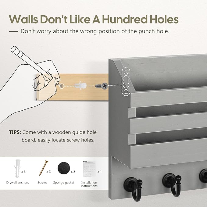 - Easy As 123 To Install: Our mail and key holder for wall comes with an instruction and a guide hole board to locate the two screw holes. Effectively avoid riddled walls. The whole process will be easy for you. Protecting both the " face " of the wall and your good mood.