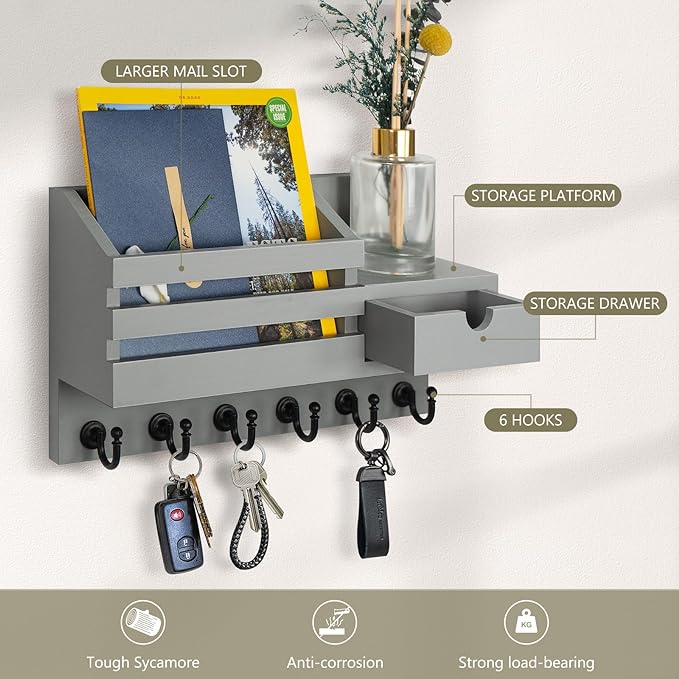 - Keep A Tidy Home: Enough hooks, good-sized mail slot, small drawer, perfectly functional for your needs. Our wall key holder has no Problem holding all those little things that clutter your space such as keys, mails, wallet, glasses, rings, cards, etc.