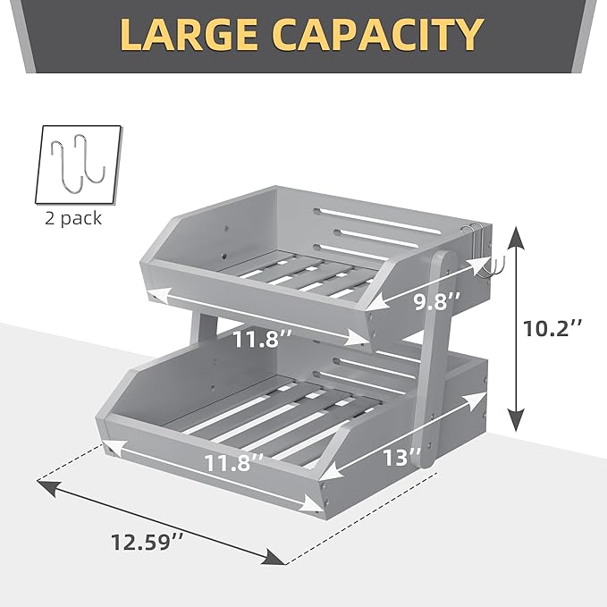 Bamboo 2 Tier Fruit Basket for Kitchen Counter, Large Capacity Fruit Storage Countertop, Fruit Holder, Wood Pantry Organizers and Storage, Kitchen Countertop Organizer With Two Banana Hangers (Grey)