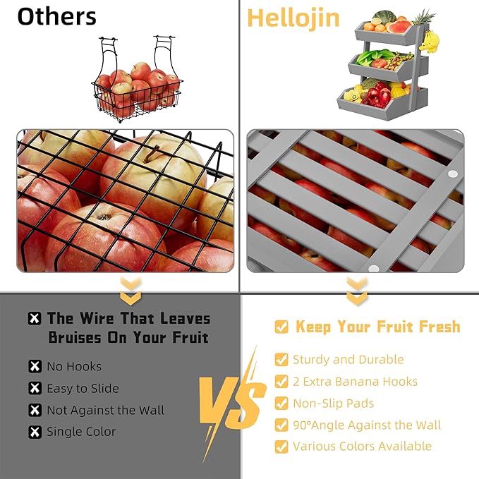 Bamboo 3 Tier Fruit Basket For Counter, Large Capacity Fruit Storage Countertop, Fruit Holder, Wooden Pantry Organizers and Storage, Kitchen Countertop Organizer With Two Banana Hangers (Grey)