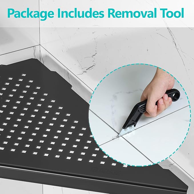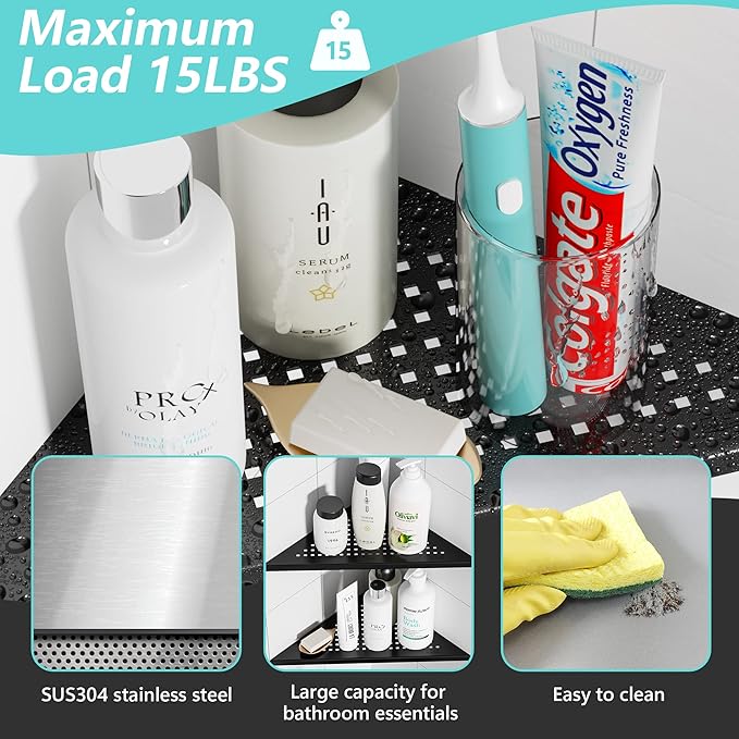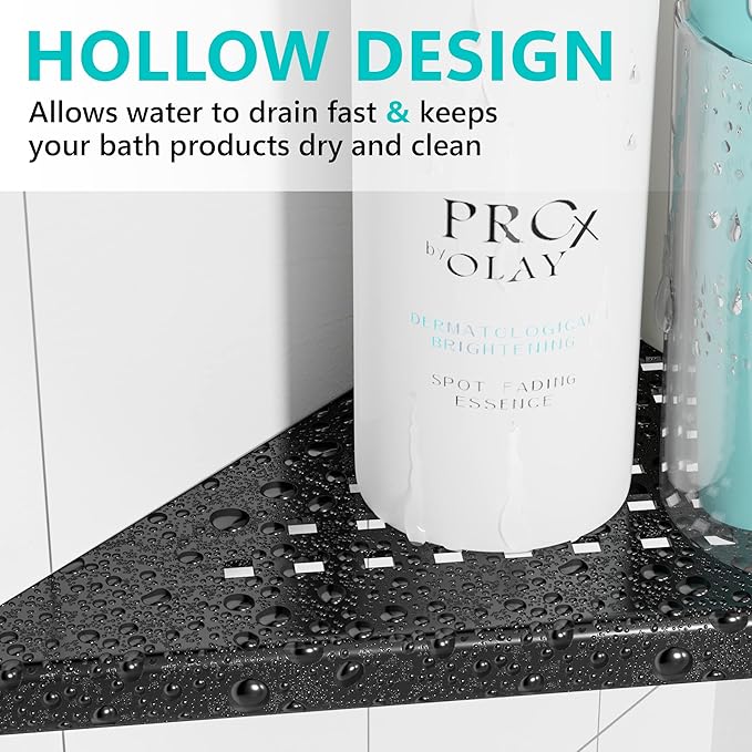 - 【Space Saving Wall Mount Corner Shelf】The triangle shaped shelf can optimize space and avoid sharp edges in your bathroom. Large capacity for holding shampoos, soaps, and many other bathroom essentials.