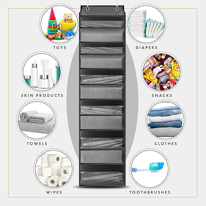 - 🏡No More Tilting: Thoughtfully crafted, our door hanging organizer is specifically designed to accommodate items of varying sizes and heavy items. The precisely stitched design between the side pockets enhances sturdiness and effectively prevents any tilting or swaying of the over the door nursery organizer. Say goodbye to concerns about items falling, as our innovative design and superior craftsmanship in the over the door clothes organizer ensures a stable and secure storage solution.