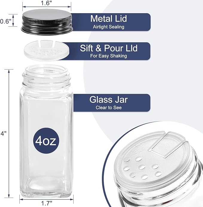 - Spice Preservation and Dispensation: The high-quality spice jars feature dual-purpose lids, ensuring both utility and freshness. The inner lid allows for sifting and pouring, providing controlled dispensation of spices. The airtight metal outer lid safeguards your spices from moisture, air, and dust, maintaining their full flavor and aroma over time.