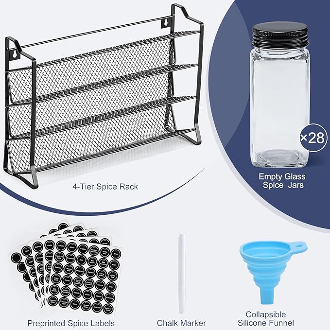 - Organized and Accessible: The spice rack's 4-tier design and quick-find labels make it easy to view and access all your spices, helping to effectively sort and organize your spice collection and reducing time spent searching for the right one during cooking.
