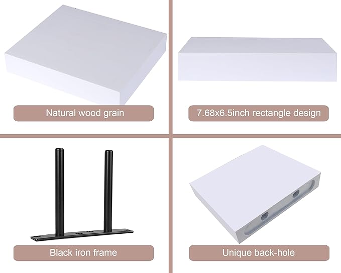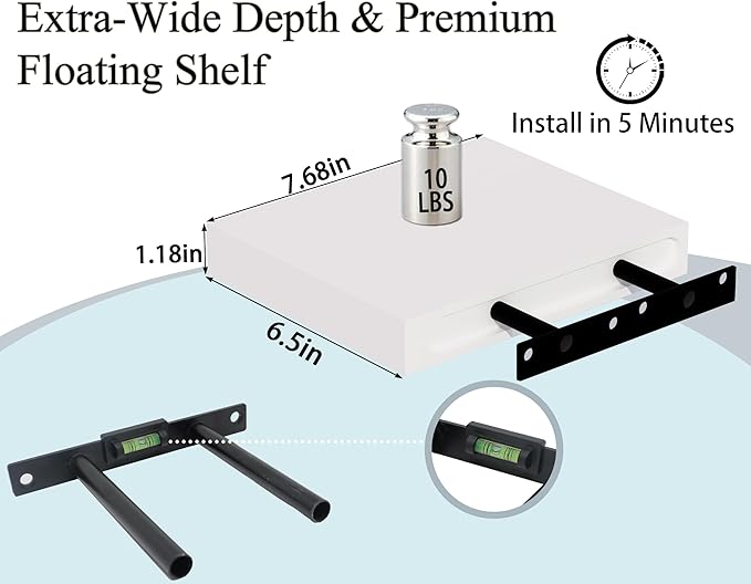 - 【Please Confirm Size Before Purchase】 Each shelf measures 7.68" × 6.5" × 1.18" and supports up to 10 lbs. Compact and space-saving, these small floating shelves are perfect for tight spaces. Double-check dimensions before ordering to ensure a proper fit.