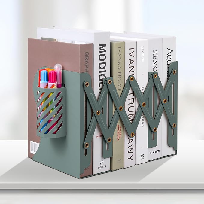 Honagu Adjustable Bookends, Metal Book Ends for Shelves Heavy Book, Desk Magazine File Organizer for Home, Office, Books, Papers, Extends up to 19 inches with Pen Holder (Green)