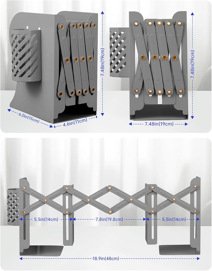 - 【Adjustable Bookend for All Sizes】The Adjustable Bookend allows you to customize the width of the holder, accommodating books of different sizes without the need for extra support. It has 3 grids in total, can be stretched up to 19 inches, and can be re-sized according to the number of books.