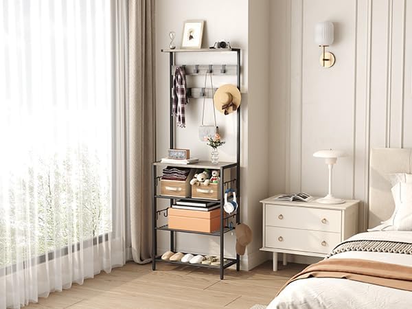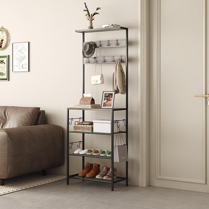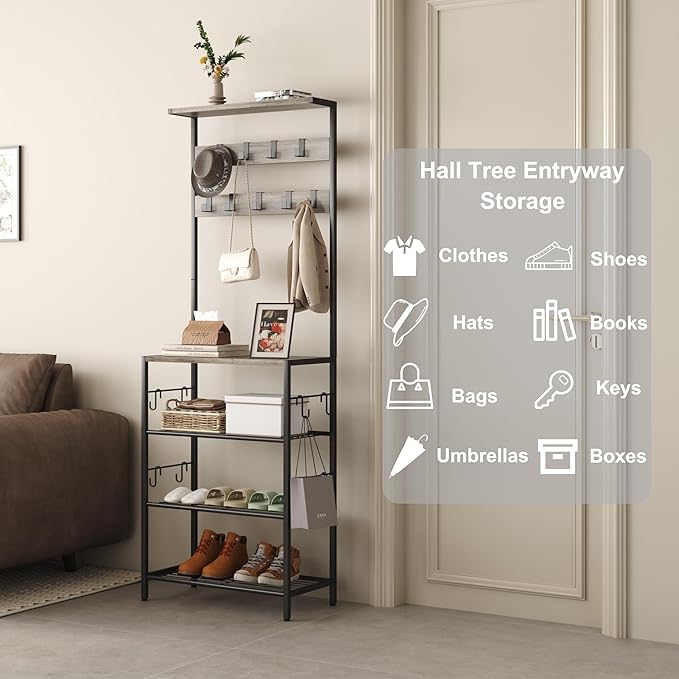 - Multi-functional Hall Tree Organizer: Featuring a top storage shelf, 2- tier coat rack with 9 hanging hooks, and a 4-tier shoe storage rack with an additional 8 small hooks on each side, this hallway tree organization system is perfect for daily storage in your entryway.