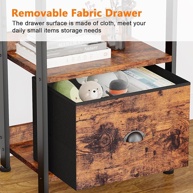 - [Shelf with Removable Fabric Drawer]: This 5 slim bookcase with a drawer, and the surface is made of cloth, which is light and soft. This design adds security, so it is suitable for use in the nursery matches 2 to 4 tier shelves. Drawer size is 13.7"W x 10.2" D x 10.2"H, same as a small storage box, can be placed anywhere, closet for storage as you like!