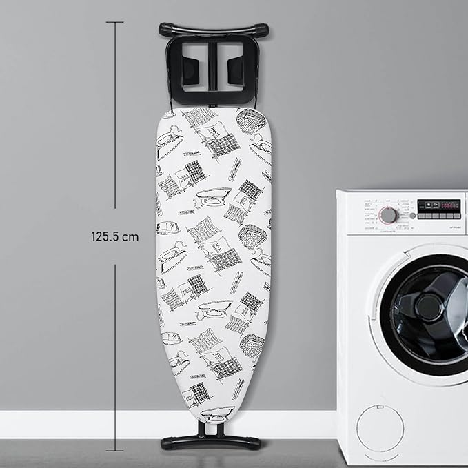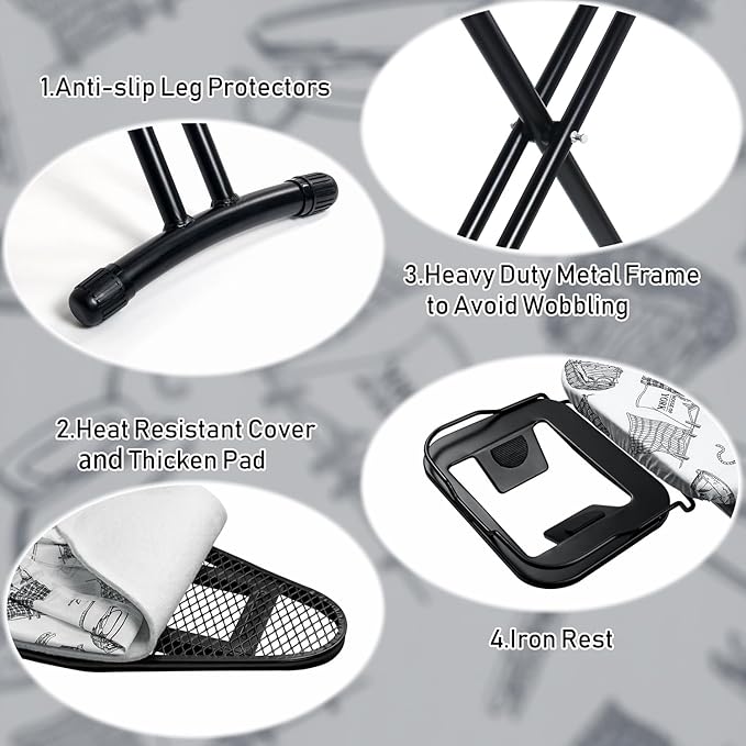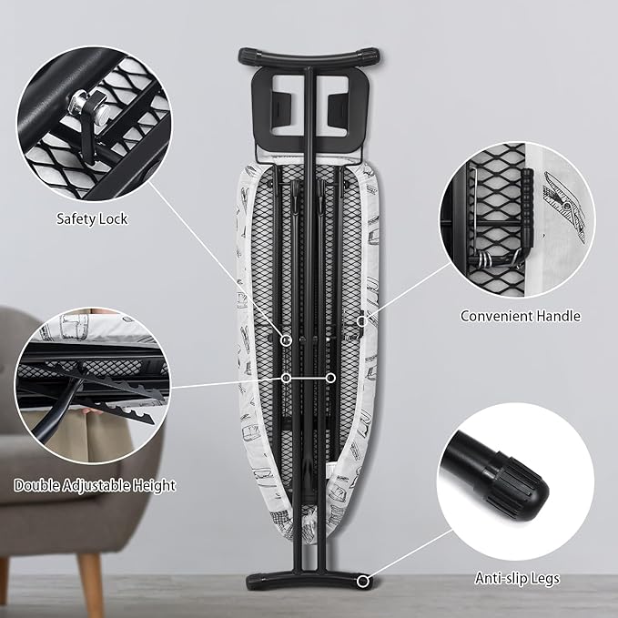 - Heavy Sturdy Ironing Boards:30 mm wide not-slip legs and children safety lock, make sure the whole structure strong and stable. Whole metal frame with classic black powder coating finish, looks new and last longer time