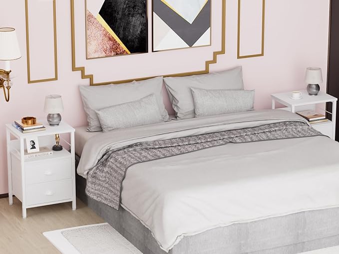 Furologee Nightstands Set of 2, End Table with 2 Fabric Drawers, Night Stand with 2 Hooks, Open Wood Shelf Bedside Table for Bedroom/Living Room/White
