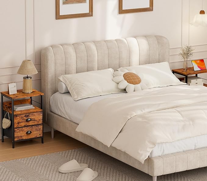 - Sturdy & Stable: Exquisite particle board and metal frame combination, and 2 metal rods on the side not only hang hooks, but also increase the sturdiness of the nightstand. 4 adjustable foot keep table stable and protect the floor. Beautiful particle board table top is simple and waterproof, wipe gently with a damp cloth and say goodbye to stains!