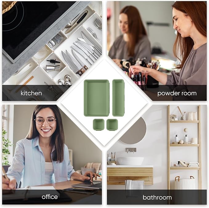 - Make Everything Organized: the desk drawer organizer tray is designed to match most drawer sizes, you can use these drawer organizers in vanity, bathroom, kitchen, office, ideal for organizing cosmetics, makeup tools, hair accessories, jewelry, pins, office supplies, craft supplies, utensils and more